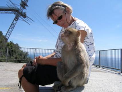Een bord lang de weg maakt in het Engels en Spaans duidelijk dat het voeren van de apen verboden is en dat er een boete op staat van 500 Pond. Bijna op de zuidpunt draait de weg en gaat verder omhoog in noordelijke richting. Hier staat een huisje, waar we aan het loket een kaartje komen om in het natuurgebied te mogen rondwandelen. En opnieuw het bord met de waarschuwing tegen het voeren. Nog geen aap te zien, maar ze moeten er dus toch nog zijn! De weg gaat steeds verder naar boven en wordt steeds smaller. Iedere keer als we worden ingehaald door een minibusje moeten we in een greppel naast de weg wachten. We krijgen het heet, er is weinig schaduw meer en de zon staat bijna recht boven ons. Plotseling zien we in een bocht auto’s stoppen en jawel, daar zijn de apen! Een achttal apen zonder staart, ongeveer een halve meter hoog en bepaald niet schuw. Ze bekijken ons nieuwsgierig, en wij hen. Ze zitten in de bomen en op de muurtjes langs de weg. Even verderop, bij de Apes’Den zijn er nog meer. Hier hangt ook een lijst met de namen en andere gegevens van de apen. De in totaal 230 apen worden periodiek gevangen en gecontroleerd op hun gezondheid. Al is het een legende, de Britten willen blijkbaar geen risico lopen.