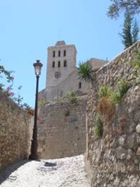 In Eivissa volgen we de bordjes naar de ‘Dalt Vila’, de bovenstad. Door een poort in een brede stadsmuur komen we in een totaal andere wereld. Geen rijen winkels, druk verkeer of drommen toeristen. Smalle, steil oplopende straatjes, een bonte verzameling van gebouwen en af en toe wat medebezoekers. Over de muur wandelen we rond de citadel. Aan de binnenzijde ligt de kathedraal, op het hoogste punt van de rots. Aan de buitenkant gaapt een afgrond van wel tientallen meters diep. Er is in het verleden dan ook vaak en meestal lang gevochten om deze stad, o.a. door Moren, Portugezen en Spanjaarden.