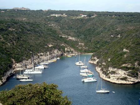 Om vanaf Sardinië Corsica te bereiken steken we vandaag de Bonifacio Strait over. Van diverse kanten waren we gewaarschuwd dat het hier meestal twee punten op de Beaufort schaal harder waait dan elders op de eilanden. De wind moet zich blijkbaar tussen de hoge eilanden door persen. Dus hebben we gewacht op een goede gelegenheid en houdt de wind zich koest tijden de oversteek. In Bonifacio zoeken we de Calanque de la Catena, een baai recht tegenover de citadel. Bij het binnenvaren zoeken we tevergeefs naar een aanlegponton, die er volgens de pilot zou moeten liggen. De boten die er liggen hebben allemaal een anker uit en lijnen naar de rotswand. Lastig, want onze bijboot ligt nog zeevast op het dek. We varen wat rond, proberen tevergeefs het hekanker en besluiten om maar het hoofdanker te gaan gebruiken. Dat gaat beter. Nu voorzichtig achteruit naar de wal, waar zich een paar ringen bevinden. We vragen een jongeman in een bijboot om ons te helpen. Hij knoopt voor ons lijnen aan de ring, maar dan liggen we nog steeds veel te dicht op onze buurman. Er tweede lijn in de richting van de wind is lastiger. Uiteindelijk klimt hij een meter of vijf de rotsen op en maakt ons vast aan een struik. Dat is beter. Nu de ketting van het anker straktrekken. Gemakkelijker gezegd dan gedaan, want de wind begint stevig aan te halen, dwars op het schip. Na een aantal meters is het te zwaar voor de ankerlier en doen we het verder met de hand. Na veel ploeteren en zweten liggen we eindelijk naar tevredenheid. De overtocht duurde drie uur, het ankeren heeft vijf uur gekost. Morgen gaat het nog harder waaien, dus vertrekken we niet maar gaan dan de stad verkennen.