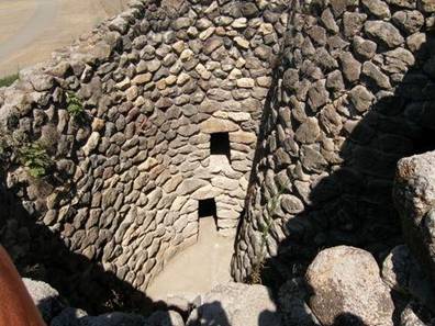 We huren samen met Jaap en Diana een auto en gaan op stap. Onderweg zien we in het heuvellandschap af en toe een ruïne van een toren bovenop een heuvel. Soms zijn er alleen een stapel stenen. Ongeveer 50 km noord van Cagliari, vlak bij het dorpje Barúmini wijzen borden ons de weg naar Su Nuraxi. Het lijkt zo van afstand ook een stapel stenen op een heuvel te zijn. Het bordje bij de afrastering meldt dat we alleen met een gids verder mogen. Gelukkig spreekt deze Engels, zodat niets van de uitleg ons ontgaat. De gids zoekt de schaduw van een boom op en vertelt over het ontstaan. Het oorspronkelijke verblijf was rond 1500 v.C. één toren, waar in de loop van de jaren vier torens aangebouwd zijn. Later kwam daaromheen een muur met een aantal torens en daaromheen uiteindelijk een groot aantal woningen. We zijn dan in de Romeinse tijd, in het jaar 500 n.C. De oorspronkelijke nuragh toren lijkt van buiten net een grote stapel stenen, allemaal netjes opgestapeld. Een stalen trap aan de buitenzijde brengt ons naar boven, waar een smalle ingang blijkt te zijn, 8 meter boven de grond. Achter die ingang blijkt een gang, waar een steile stenen trap ons weer naar beneden brengt. De stapel stenen blijkt dus hol te zijn. Ze zijn zo gestapeld, dat er in de toren een aantal ruimtes ontstaan, een stelsel van kamers en gangen. De muren zijn soms 7 meter dik. Woonruimtes met verdiepingsvloer, voorraadkamers, slaapnissen, het archeologisch onderzoek heeft veel duidelijk gemaakt. Hier zijn dus die bronzen beeldjes gevonden, die we in het Archeologisch Museum hebben gezien. Nog zijn er nog vele vragen, zoals hoe men het klaar heeft gespeeld om stenen van soms 3000 kg. Over kilometers afstand te vervoeren en die omhoog te krijgen om te stapelen. Ook is een grote vraag waarom deze plaats op een gegeven moment weer verlaten is. Een geluk voor ons, want nu kunnen wij ons proberen voor te stellen hoe deze mensen 3500 jaar geleden geleefd hebben. En er is nog veel te ontdekken. Alleen al in deze buurt zijn er 80 plaatsen, waarvan de naam op de één of andere manier in verband gebracht kan worden met de Nuraghs. Er ligt waarschijnlijk nog veel verborgen.