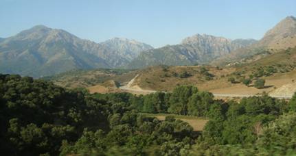 De omgeving wordt steeds mooier. We treffen het; er is geen bewolking en het zicht is uitstekend. Hoge bergkammen rondom ons steken scherp af tegen de blauwe lucht. De trein, die in de laagvlakte nog een flinke snelheid had, kruipt nu soms langzaam een helling op en kronkelt langs de wanden van steile hellingen en diepe afgronden. Als we over een brug rijden, zien we honderd meter onder ons wat bosjes langs een lege rivierbedding staan. Niet het meest geliefde uitzicht voor iemand met een flinke hoogtevrees. Maar dan wordt de aandacht al weer gevangen door een prachtig vergezicht met kale granietrotsen boven en bossen onder, heel diep in de dalen.