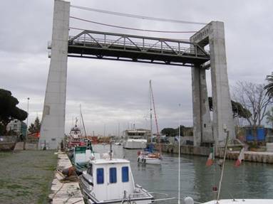 We staan vroeg op om rustig de laatste voorbereidingen te kunnen doen. Aan het eind van het winterseizoen blijken we met een groot aantal lijnen aan de wal vast te liggen, en die moeten allemaal los. En verder moet alles weer zeevast gezet worden, want het waait flink. Ruim een half uur voor de brugopening zien we al een boot voorbijkomen. Die wil vast de brug niet missen. Even later zien we tot onze schrik de brug omhoog gaan, een half uur vroeger dan gepland. Snel starten we de motor en gooien de laatste lijnen los. Oef, net op het nippertje. We vragen ons maar niet meer af, hoe dat nu weer komt. Dit soort verrassingen horen er nu blijkbaar bij, hier in Italië.