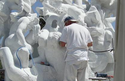 In het buitengebied staan er geen rijen winkels meer langs de straat, maar grote huizen afgewisseld met bedrijven. Ondertussen passeren ons om de paar minuten reusachtige vrachtwagens met grote blokken marmer, blijkbaar op weg naar de haven. Dan zien we een open terrein, waar en aantal mensen druk bezig zijn om van blokken marmer beelden te maken. We lopen het terrein op en worden vriendelijk toegeknikt. We mogen rondkijken, er worden in een werkplaats zelfs een aantal lampen aangestoken. In deze werkplaats en er om heen worden door vader, zoon, dochter en een aantal anderen hard gewerkt aan beelden, van 50 cm tot wel 3 meter. Met slijpschijven, hamers, grote en kleine beitels worden het marmer vormgegeven. We vragen naar het museum, en dat blijkt niet ver meer.