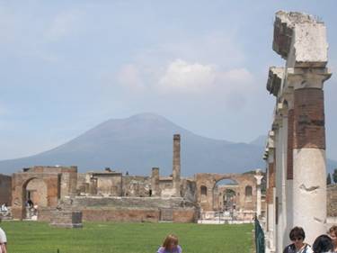 Vandaag hebben we een tijdreis gemaakt van zo ongeveer 4000 jaar! Vroeg met de trein van Salerno naar Pompeï. Vanaf het station is het 15 minuten lopen, een kaartje met barcode kopen, door een elektronisch poortje, en dan sta je ineens in Pompeï van het jaar 79. Maar dan zonder de mensen die er toen leefden. Van de 20.000 inwoners zijn er waarschijnlijk 2000 levend begraven, toen de Vesuvius vuur begon te spuwen, net als de stad. Onder een laag van vier meter vulkaanas heeft de stad de eeuwen overleefd. In het bijzonder Mussolini heeft, ter meerdere ere en glorie van Italië en zichzelf, veel geld ter beschikking gesteld om de stad weer uit te graven. Nu lopen we weer door dezelfde straten, over dezelfde pleinen als weleer, en door dezelfde grote huizen, tempels en basilieken. Wel kunnen we nu rustig midden op straat lopen, zonder tot in de enkels in het vuil van de stad te zinken. De stapstenen, een soort van prehistorisch zebrapad, gebruiken we om van de ene naar de andere kant te komen. We kijken goed uit om zeker te zijn, dat er geen kar aankomt; de sporen zijn duidelijk in het wegdek te zien.