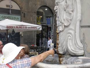 Aan boord is het geen probleem. We hebben flinke tanks en daarin zit goed drinkbaar water. Maar de afgelopen dagen zijn we de wal op geweest. Vanuit Livorno waren Pisa, Florence en Lucca goed bereikbaar. Steden die allemaal hun aantrekkingskracht hebben op diverse gebieden. Opnieuw veel te veel om te zien, maar voor een eerste kennismaking kunnen we door een selectieve keus een aardige indruk krijgen. En dan merk je ineens dat we in Rome wel erg verwend waren met al die nasi in de stad; watertappunten in de vorm van een neus. Prima drinkwater en altijd koel. In Pisa zien we er niet één. De kraan in een openbaar toilet moet uitkomst bieden. In Florence is het al wat beter. Vaak een beetje achteraf, maar we vinden ze toch op verschillende plekken. In Lucca idem dito. Vaak met een kraan er op, zodat er ook geen water verspild wordt. Maar toch een verschil met Rome….. Ach, je weet pas wat (gehad) hebt, als je het mist.