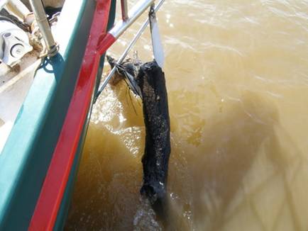 En toen! Iedere avond gooien we op de Guadiana een grote haak overboord: ons anker. En vanmorgen hebben we ineens veel moeite om hem op te halen. Tineke ziet vanuit de kuip de neus hoe langer hoe dieper gaan, terwijl de ankerlier hard begint te kreunen. Schakel voor schakel komt de ketting boven water, totdat we het anker zien. En dan blijkt dat we echt beet hebben. Er hangt een stuk boomstam van enkele meters en zo’n veertig centimeter diameter aan de ‘haak’. Dat verklaart alles, maar echt blij zijn we niet met deze vangst. Met behulp van een lijn lukt het om het anker weer vrij te krijgen, en met een plons verdwijnt de vangst weer in de Guadiana.