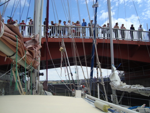 Samen met twee andere zeiljachten kijken we toe, hoe de sluisdeuren open gaan en een groot aantal zeil- en motorjachten de sluiskolk uitvaren. Ondertussen staat de sluismeester ons met een megafoon toe te roepen. Voor ons onverstaanbaar, maar onze buurman zegt dat wij aan bâbord aan moeten leggen. Prima, dat hebben we ook het liefste. De sluismeester neemt de landvast aan en neemt ons mee tot nagenoeg tegen de brug, die over de sluiskolk ligt. Verder kunnen we niet. Voor ons, achter de brug, is nog een derde van de kolk leeg. Achter ons blijken steeds meer jachten binnen te komen. Twee motorjachtjes passen onder de brug door. Ieder jacht wordt door de sluismeester naar zijn plek gedirigeerd, waarbij hij er voor zorgt dat er geen centimeter onbenut blijft. Als wij twee zeiljachten naast ons krijgen is de doorgang naar voren geblokkeerd en blijft het onder en achter de brug verder leeg. Na twee uur passen en meten is de kolk helemaal vol, maar er liggen nog steeds een aantal jachten voor de sluis. Via de megafoon krijgen ook zij instructies. Dan gaat de brug open, en gaan wij naar de lijnen om het schutten af te wachten. Tot onze verbazing zijn de sluisdeuren nog dicht, als de sluismeester ons duidelijk maakt dat we los moeten maken. Hij begint aan de voorste lijn te trekken, maar dat heeft weinig effect. We starten snel de motor en helpen maar een beetje. Met onze buren langszij varen we nu door de brug tot aan de sluisdeuren en moeten daar weer vastmaken. Hé, de deuren aan de andere kant staan nog open! Zou de hele volle kolk…. Ja hoor, dat is de bedoeling: iedereen naar voren zodat er achter nog een paar jachten bij kunnen. Maar omdat die twee motorbootjes al voorin lagen, past het ineens niet meer en wordt het een leuke bende. Er vallen diverse gaten, bijboten worden niet te passeren obstakels en de sluismeester blijft maar roepen dat iedereen maximaal aan moet sluiten! Als na ruim een half uur er nog een paar jachten bij zijn geperst, de deuren achter dichtgaan en het water stijgt, staat de brug nog steeds open. Even later gaan de sluisdeuren voor ons open en kunnen we verder. Een schutting van bijna drie uur! En wij dachten nog wel dat we het geluk van een snelle doortocht hadden.