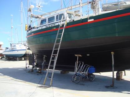 Het leven op de wal bevalt ons niet zo erg. Voor alle duidelijkheid: we hebben het hier over het leven op een schip, dat met zijn kiel op de grond staat en door diverse stutten en steunen rechtop wordt gehouden. Om op het schip te komen moet je een laddertje op, en bevind je je op ongeveer drie meter boven het beton. Daar leven we dan als normaal: eten, drinken, slapen en uitrusten; veel uitrusten. Want we zijn het niet meer gewend om de hele dag in de meest lastige houdingen te steken, schuren en schilderen. Iedere meter onderwaterschip hebben we wel zes keer onder handen gehad. Maar we zijn best trots op het resultaat: het onderwaterschip zit weer strak in de onderwaterverf. Ook de andere klussen zijn klaar, dus konden we vanmiddag weer het water in. We moeten nog even wachten op het beëindigen van de onderhoudsbeurt van de botenlift. Een geweldige service, nietwaar? Trouwens, waar tref je nog een werf, waar een medewerkster bijna dagelijks langskomt om de vloer onder het schip aan te vegen?