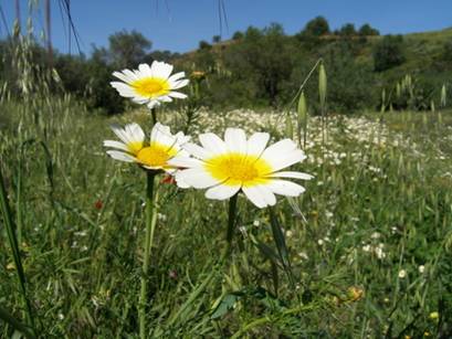 En nu wandelen we inderdaad iedere dag urenlang door groene heuvels, die bezaaid zijn met prachtige bloemen. Het lijkt wel af alles nu tegelijk wil bloeien, voordat het straks weer heet en droog wordt. In de riviertjes en beekjes stroomt nu nog water. De perzikboom hangt vol met helder gele vruchten. De vijgen kleuren al donker.