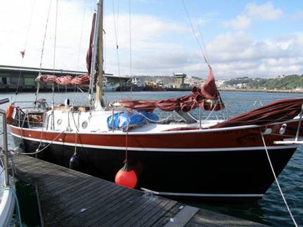 Nadat de marina en de GNR alle formaliteiten hebben afgewerkt, kunnen we onze nieuwsgierigheid niet langer bedwingen, en lopen naar de andere steiger. Inderdaad, het kan niet missen! Dit is een stalen Brasser 28, met zijn typische knik in het voordek, de preekstoel op de boegspriet, het aangehangen roer en kluiver en fok op een boom. Op ons roepen volgt geen reactie, niemand aan boord dus.