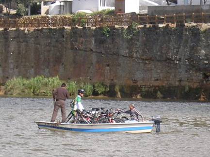 Gisteren hadden we al te horen gekregen dat we niet meer aan het ponton zouden kunnen liggen. Voor tienen staan er al een paar schippers van kleine bootjes klaar om onze plek in te nemen. Wij gaan in de rivier voor anker. “Waarom zo vroeg?” vragen we ons af, het waterpeil is nog lang niet hoog genoeg voor de rondvaartboot. De mannen drentelen wat op de steiger, tot na een uurtje ineens een groep mountainbikers verschijnt. Het zijn er wel honderd. Acht fietsen gaan in de ene boot, evenzoveel fietsers in de andere en zo gaat het met veel motorlawaai naar de andere oever. Na een uur zijn de laatste overgezet, wordt er afgerekend en verdwijnen de laatste bikers over de heuvels. De stilte keert weer.